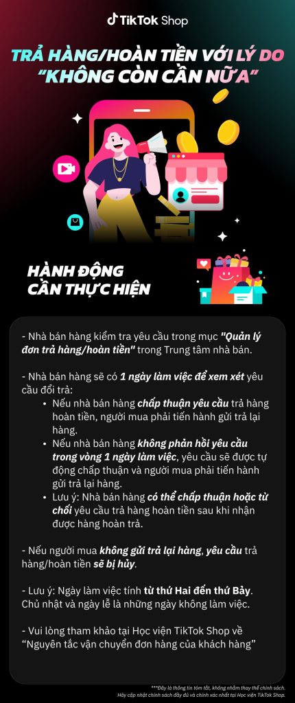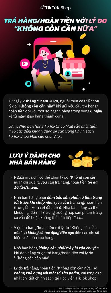 Từ ngày 7 tháng 5 năm 2024, người mua có thể chọn lý do “không còn cần nữa” khi gửi yêu cầu trả hàng/ hoàn tiền đối với một số ngành hàng.